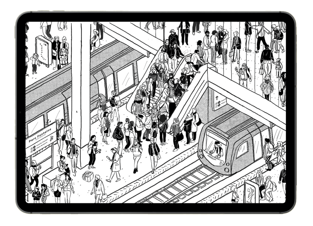 Le jeu emmène les participant.e.s dans plusieurs décors associés à la foule, et les fait réfléchir à différentes situations à forte densité spatiale. Trois contextes de foules sont illustrés: un hall de gare, un quai de métro et l’intérieur d’un bus. Dans chacun de ces scénarios, des éléments problématiques émergent: une personne qui semble faire un malaise (comment bien réagir dans cette situation?), un enfant perdu, des individus qui gênent la circulation… L’objectif du jeu est d’identifier ce qui pose problème, trouver des solutions, deviner les émotions, pensées et intentions de personnages, et répondre à des questions concernant les foules. La réussite d’un objectif permet de passer au niveau suivant et de découvrir un nouveau scénario ou un nouveau questionnement relatif à la foule.