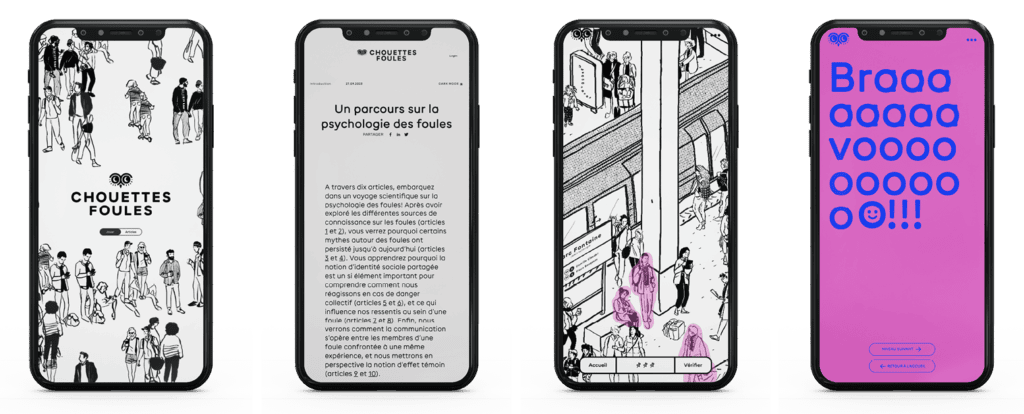 Le jeu Chouettes Foules est un jeu en ligne, qui a été disponible de Novembre 2023 à Juin 2024. Il a été réalisé dans le cadre d’une expérimentation menée par un consortium de recherche sur la psychologie des foules, réunissant le Laboratoire de Psychologie Sociale et Cognitive (LAPSCO, Université Clermont-Auvergne), le Laboratoire de Psychologie et d’Ergonomie Appliquées (LaPEA, Université Paris Cité) et l’entreprise Strane Innovation, avec le soutien de la Fondation MAIF.